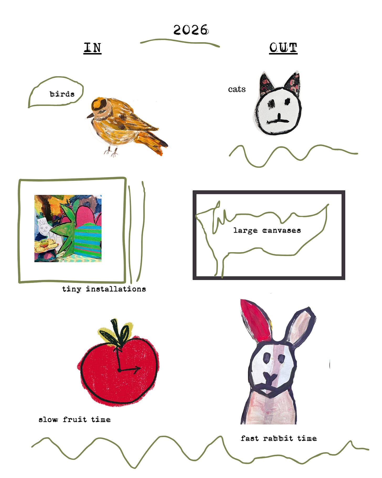 My personal new year doesn’t start until spring but my Gen Z son shared his Ins & Outs with me so I thought I’d have a go (see above). Definitely out: Scampering around like a rabbit. In: Slow growing like an apple on a tree.